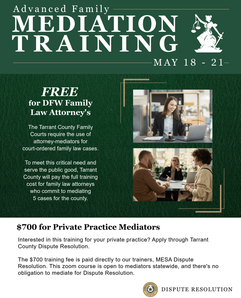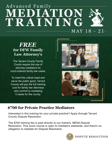 The 30-hour family training meets the Texas ADR Act requirements for mediators conducting court-ordered family mediation and adhering to the standards set by the Texas Mediation Trainers Roundtable. The sessions include family law, family dynamics, domestic violence, child development, and ethical and practical considerations in a combined lecture and role-play environment.
